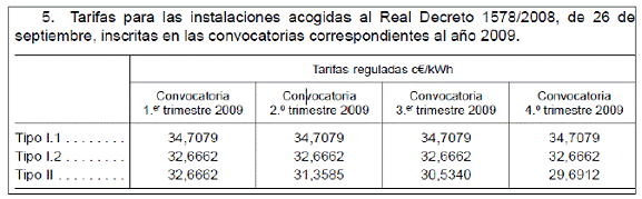 Las tarifas para las instalaciones acogidas al Real Decreto 1578/2008, de 26 de septiembre, inscritas en las convocatorias correspondientes al año 2009, quedan de la siguiente forma: