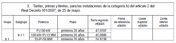 Las tarifas de la energía solar fotovoltaica según el RD 661/2007, quedan según la siguiente tabla: