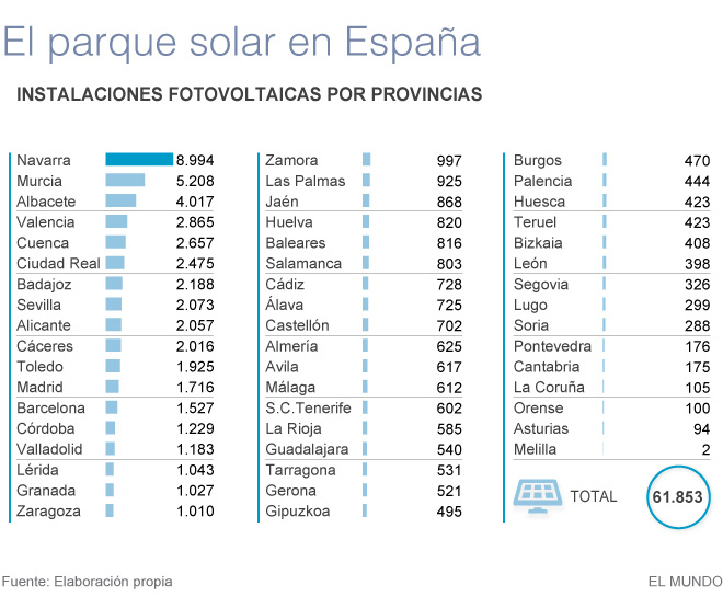 En España hay ahora mismo alrededor de 62.000 pequeños productores de energía fotovoltaica que están en el punto de mira de la eléctrica. Un tercio de estos huertos solares se concentra en las provincias de Navarra, Murcia y Albacete.